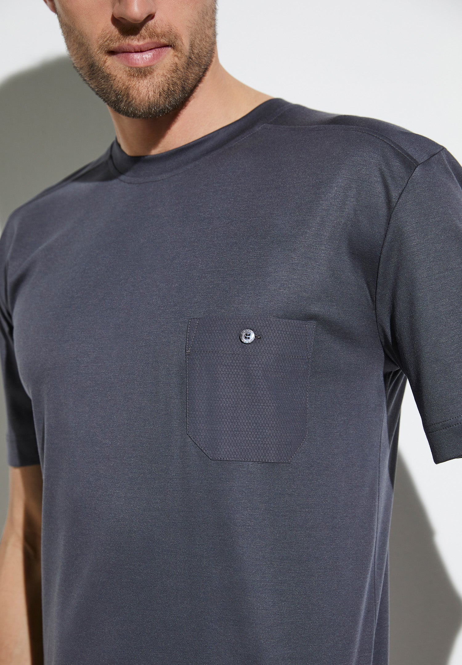 A short-sleeved shirt made from cotton and modal. This blend of materials is particularly breathable and skin-friendly. modal is produced from sustainably cultivated beech fibres and can absorb far more moisture than other varieties of cotton. The fabric produced from these fibres is also exceptionally soft and has a natural silky sheen. This shirt comes in a relaxed fit and has a round neckline. The border trim is flat and will not ride up. The short-sleeved shirt is very light and gently caresses the skin. At the front there is a chest pocket on the left, which is closed with a pearl button. This shirt is exceptionally versatile. Thanks to its simple design, it is a genuine classic, particularly suitable for everyday wear. This is a timeless basic: a comfortable loungewear garment to enjoy at home, or a great look for outdoor wear. A comfortable short-sleeved shirt in a restrained colour selection, suitable for lots of different looks and representing a simple sporty style. This garment also highlights the importance of high-quality materials and the finest finishing.