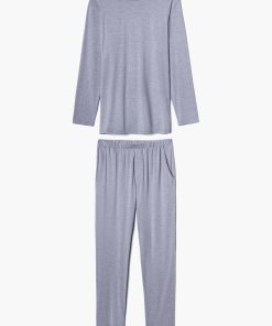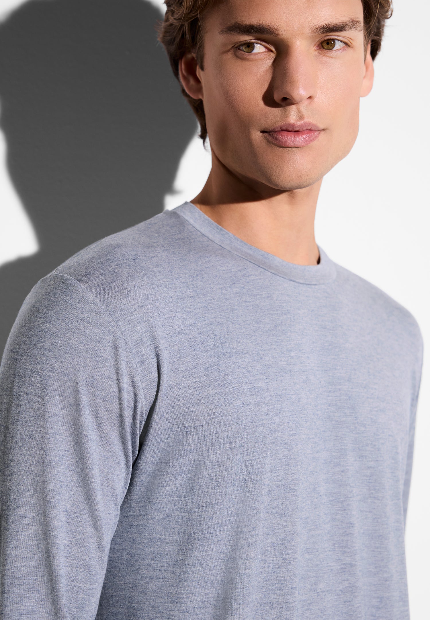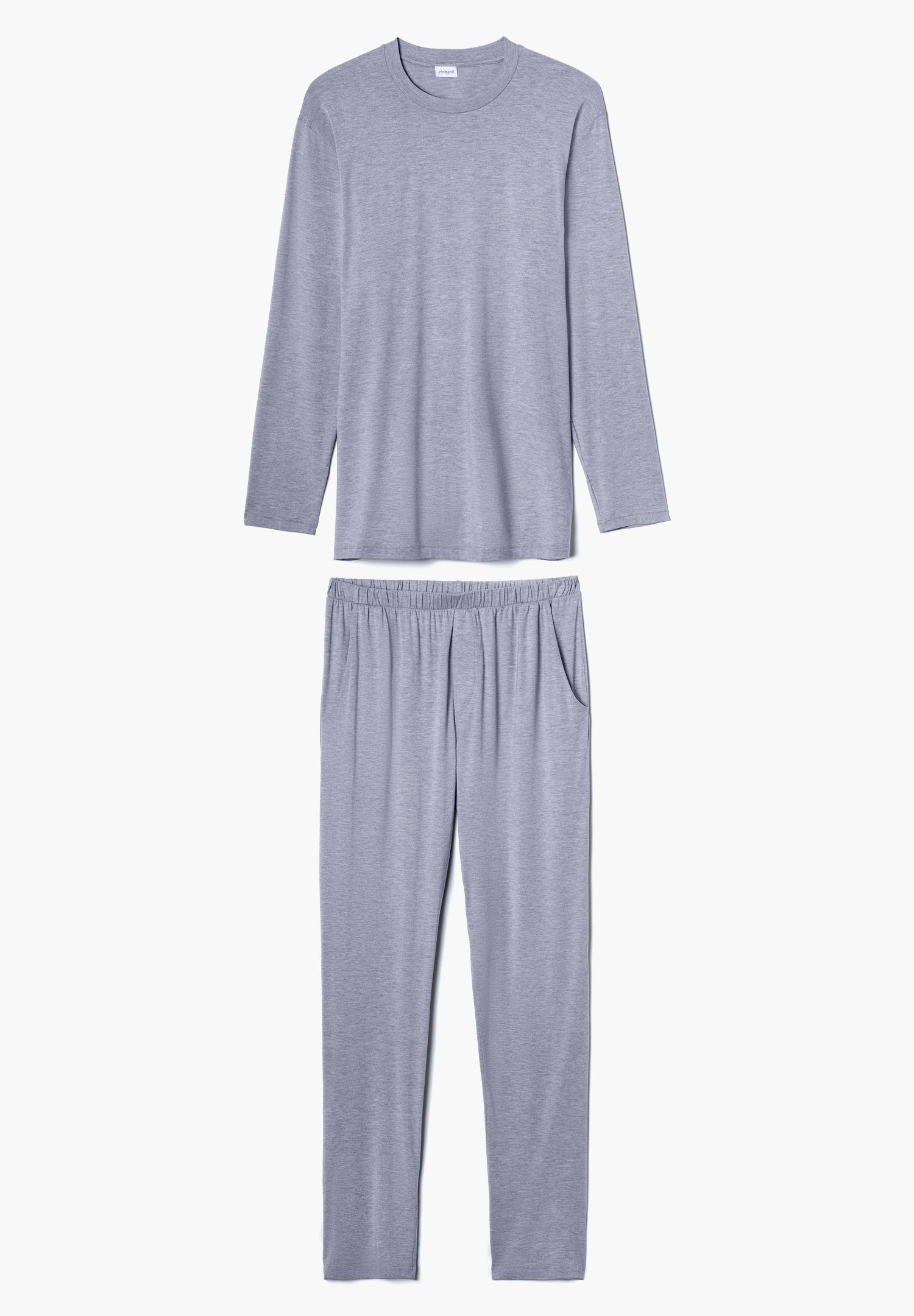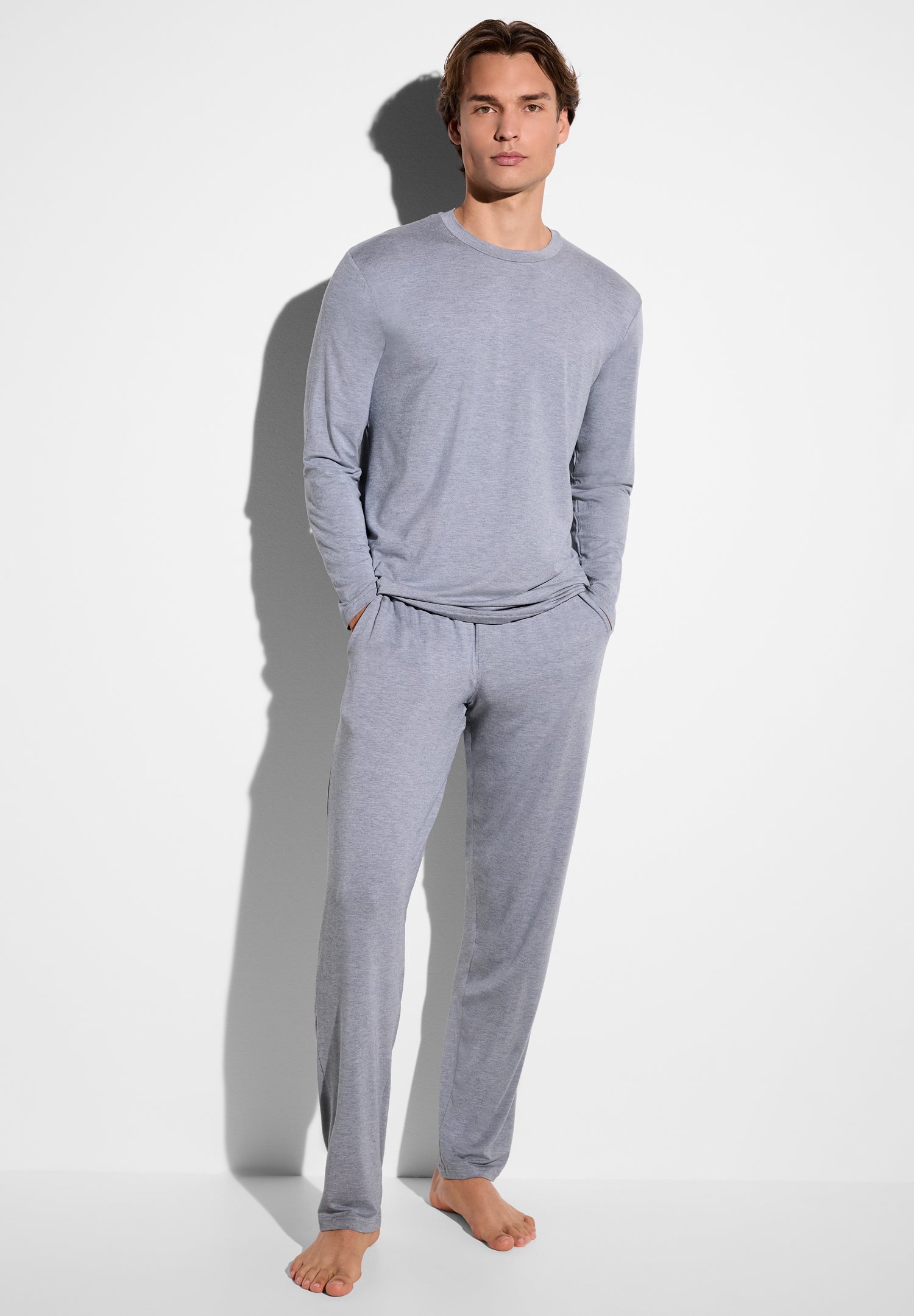 Pure softness combined with flexibility for comfort and a soft shimmer. This long pyjamas for men impress with its comfortable, loose cut, offering flexibility to allow casual movement. The pyjama top with long sleeves has an attached round neckline with an inner band in contrasting colour. The long sleep pants have a hidden elastic waistband in contrasting colour as well as two slightly slanted side pockets in the same contrasting colour. The pants have a straight cut and an additional square pocket on the back right side and a purely decorative opening at the front without a button.