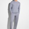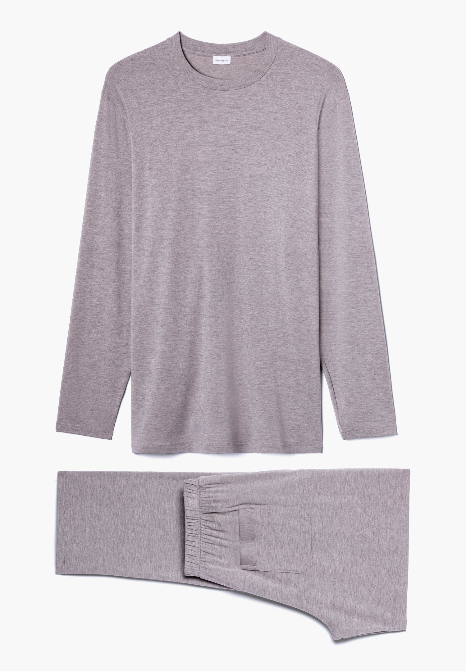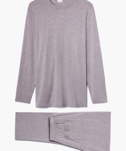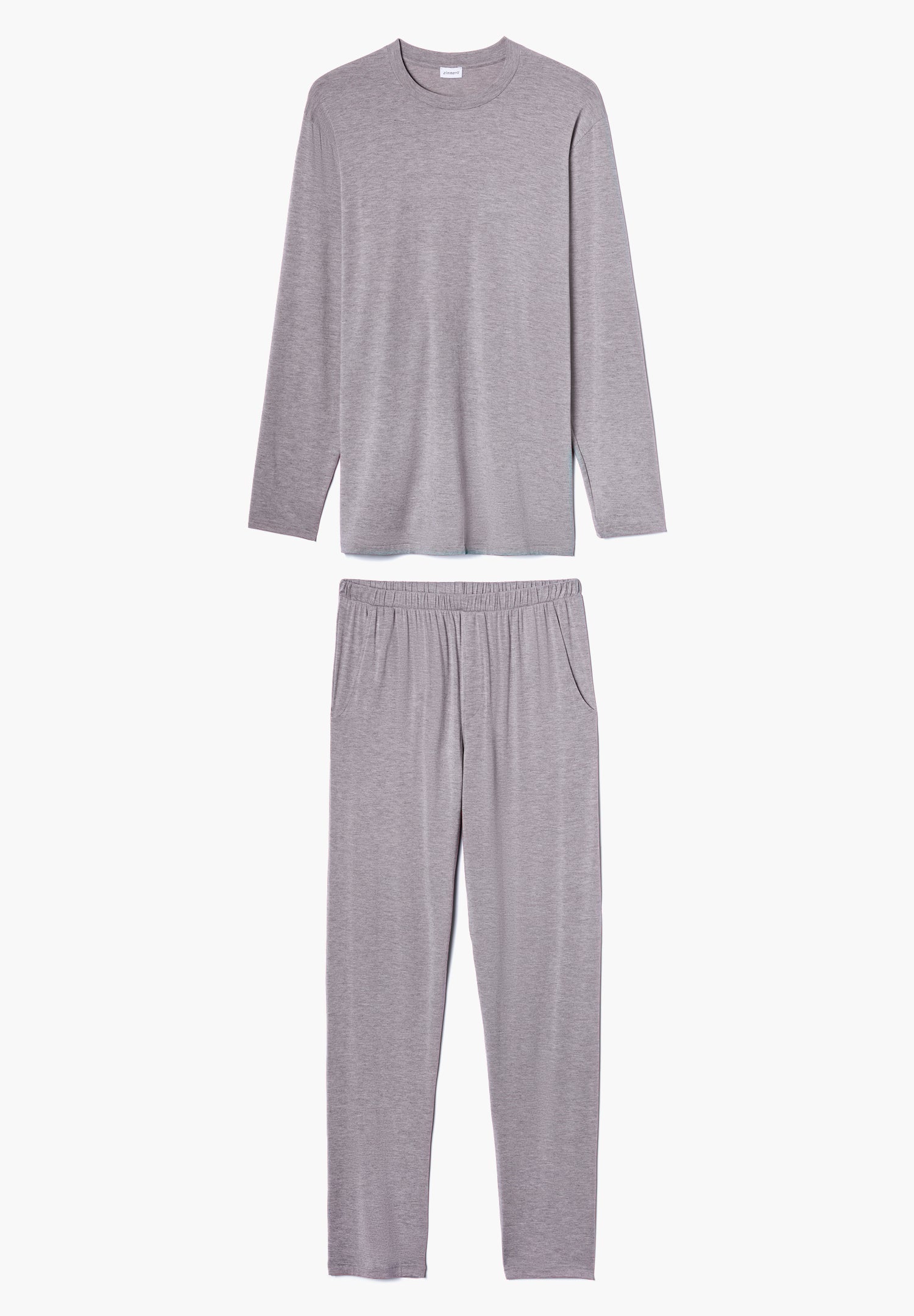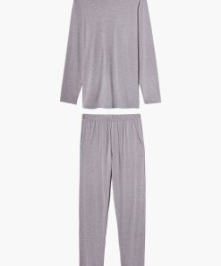 Pure softness combined with flexibility for comfort and a soft shimmer. This long pyjamas for men impress with its comfortable, loose cut, offering flexibility to allow casual movement. The pyjama top with long sleeves has an attached round neckline with an inner band in contrasting colour. The long sleep pants have a hidden elastic waistband in contrasting colour as well as two slightly slanted side pockets in the same contrasting colour. The pants have a straight cut and an additional square pocket on the back right side and a purely decorative opening at the front without a button.