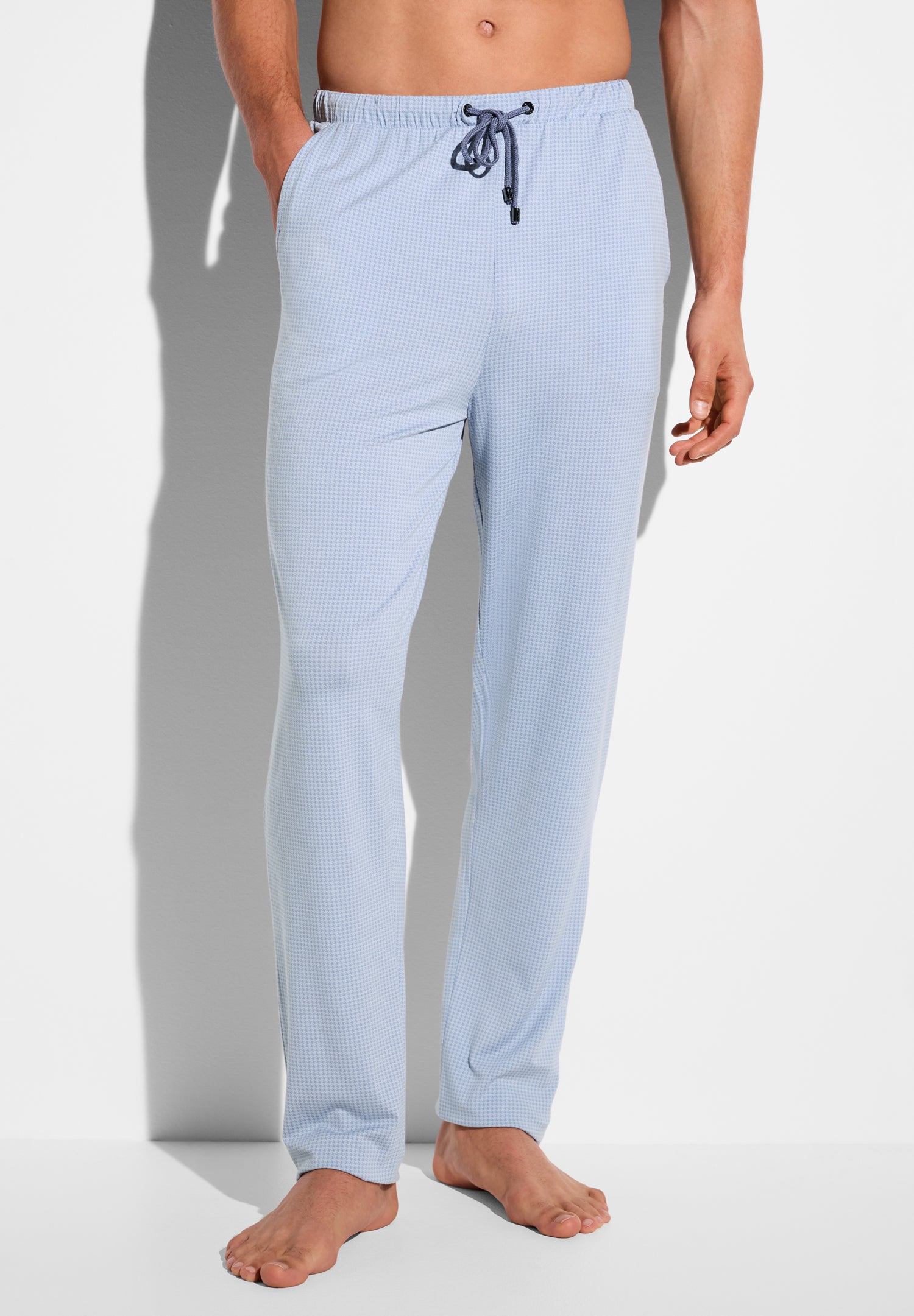 Superior softness and temperature balancing meets decorative print. These long pants for men impress with a hidden, elastic waistband and additional drawstring with cord for fine adjustment. The ends of the cords as well as the cord eyelets are finished with grey metal elements on which the Zimmerli of Switzerland logo has been engraved. There is a slightly slanted pocket on each side. The cut is loose and comfortable offering enough freedom of movement.