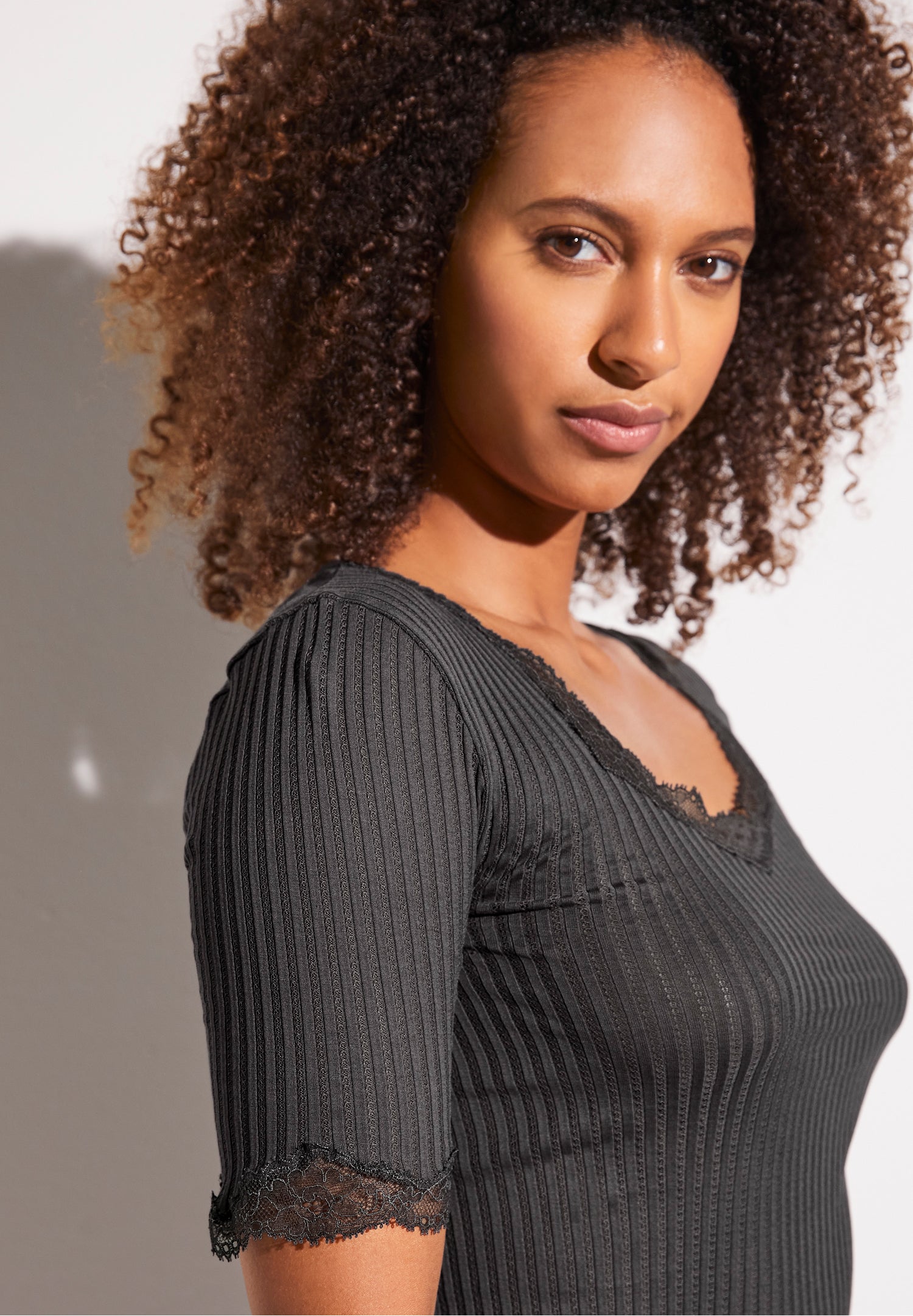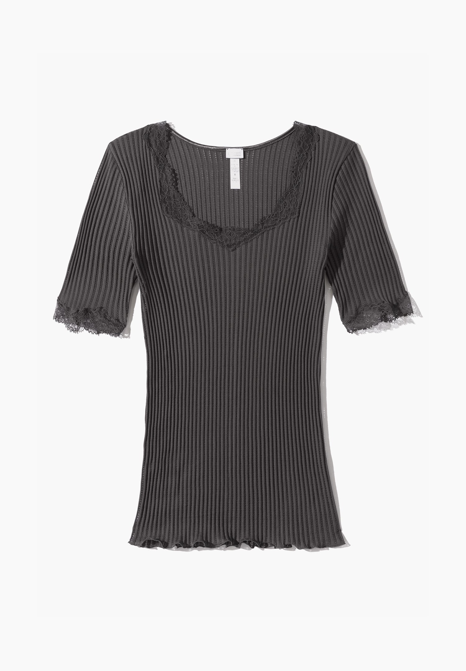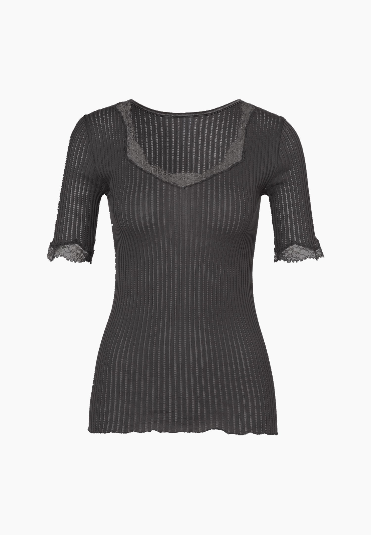 The light and airy Ajouré-Rib conceals small works of art. Filigree patterns intertwine the pure cotton of this shirt, adorned by delicate Calais lace: luxuriously crafted by hand, in the seasonal colour Dark Shadow, these can be perfectly worn as tops.