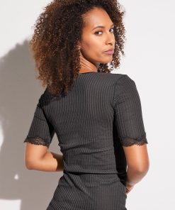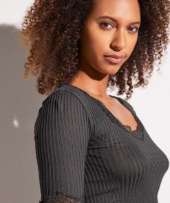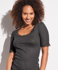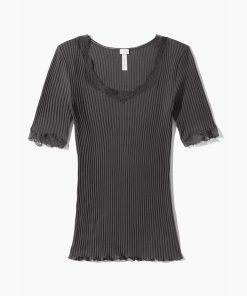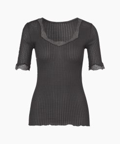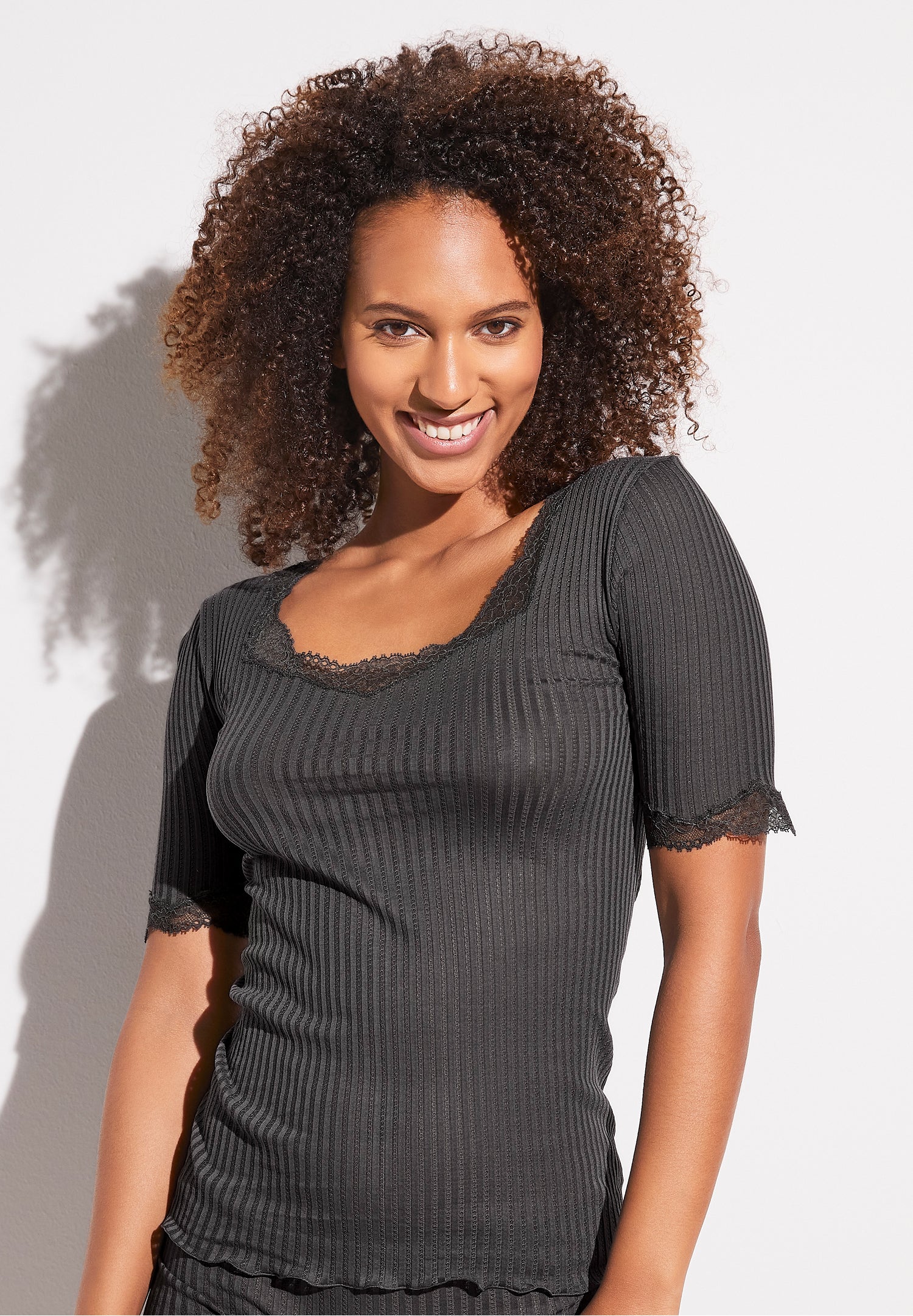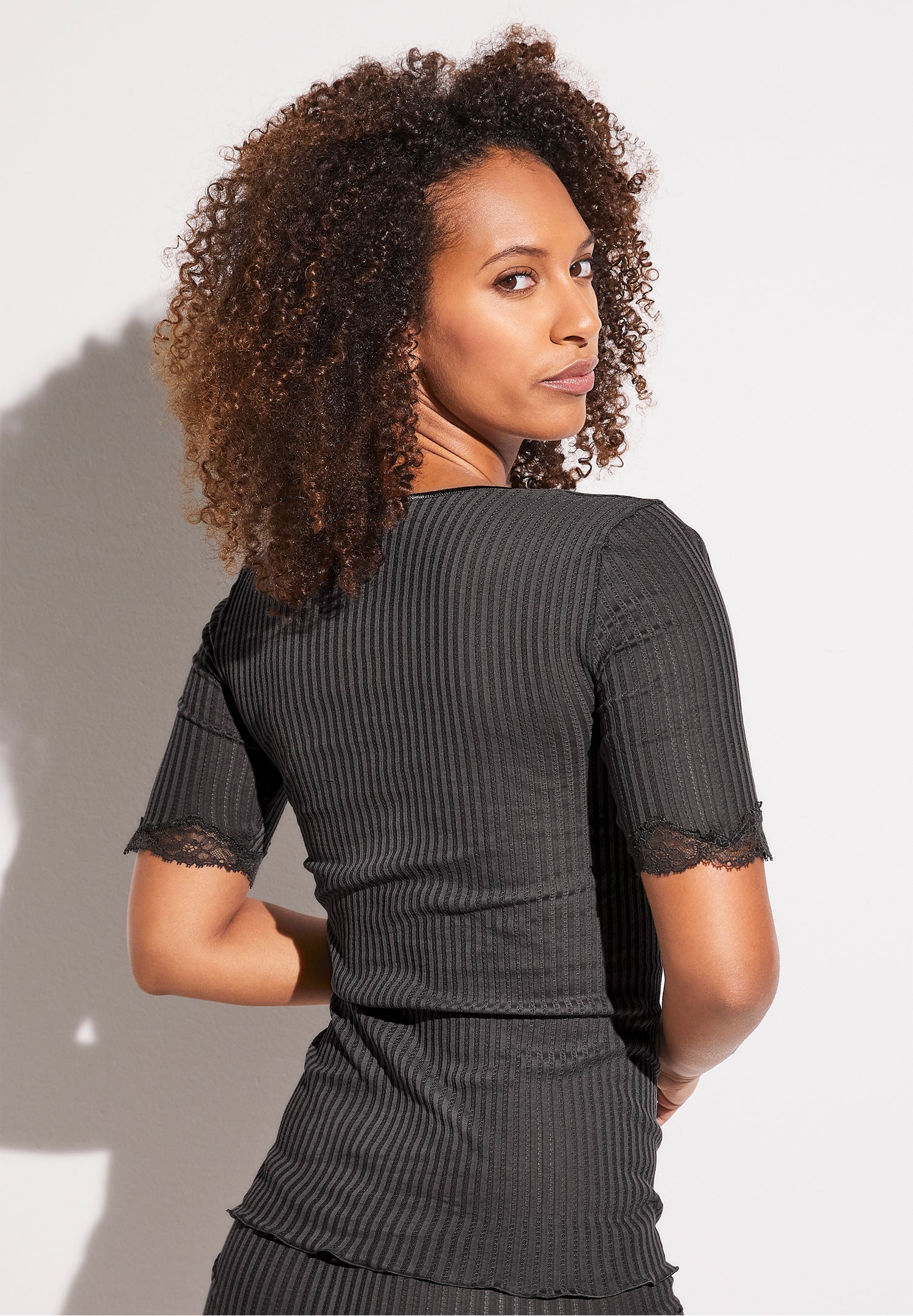 The light and airy Ajouré-Rib conceals small works of art. Filigree patterns intertwine the pure cotton of this shirt, adorned by delicate Calais lace: luxuriously crafted by hand, in the seasonal colour Dark Shadow, these can be perfectly worn as tops.