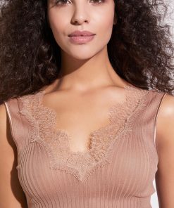 One-of-a-kind thin Richelieu fine rib fabric with two differently wide ribs decorated with delicate, floral eyelash lace. The top with broad straps for women charms with a deep, wavy V-neck which is trimmed with eyelash lace. At the centre of the neckline the lace details meet and cross each other. The back neckline as well as the armhole openings are bordered with a shimmering band. The hem is slightly ruffled as a result of a special sewing technique.